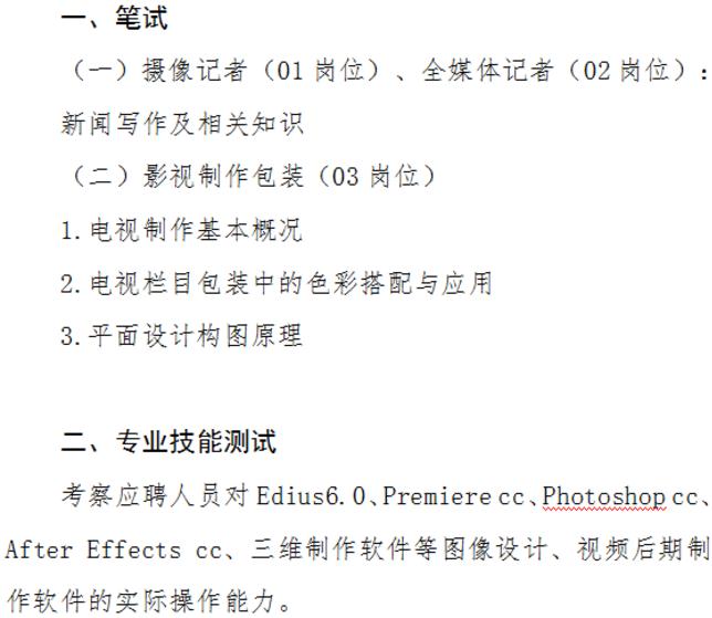 攝像記者(01崗位)、全媒體記者(02崗位)考試方式為筆試和面試,影視制作包裝(03崗位)考試方式為筆試、面試和專業(yè)技能測(cè)試。